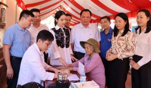 Ông Võ Tấn Đức – Phó Bí thư Tỉnh ủy Đồng Nai và bà Lê Nữ Thùy Dương (giữa) và các đại biểu động viên, hỏi thăm người dân đến khám bệnh trong chương trình tại xã Long Phước